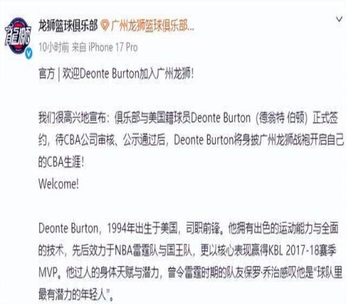 广州男篮作为CBA第一阶段大黑马球队之一,在没有大手笔引援的情况下,取得了10胜12负的成绩,在少赛一轮的情况下,目前暂列联赛第十三名,整体表现远超俱乐部预期。这个休赛期,广州男篮又在积极调整外援阵容,俱乐部官宣裁掉了锋线外援托马斯,签下NBA级后卫德翁特-伯顿。托马斯第一阶段的表现很不理想,场均出战18.4分钟贡献8.5分5篮板2.4助攻,投篮命中率44.7%,三分命中率只有27.5%,攻防两端的表现远低于俱乐部的预期,被裁掉也在意料之中。为了提升球队整体进攻实力,广州男篮还是签下了此前代表球队参加过NBA夏季联赛的德翁特-伯顿,后者待CBA公司审核、公示通过后,将身披广州龙狮战袍开启自己的CBA生涯!