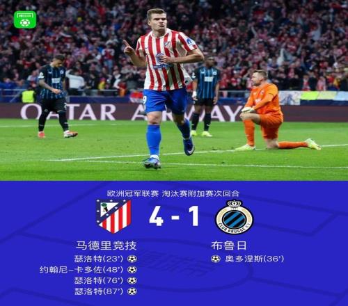 北京时间2月25日欧洲冠军联赛 淘汰赛附加赛次回合,马德里竞技对阵布鲁日。上半场瑟洛特破门首开记录,随后奥多涅斯头球扳平比分。下半场卡多佐破门再度将比分超出,瑟洛特补射梅开二度将比分扩大,随后鲁杰里助攻瑟洛特抢点破门完成帽子戏法。最终比分马竞 4-1 布鲁日。两回合总比分马竞7-4布鲁日晋级16强。